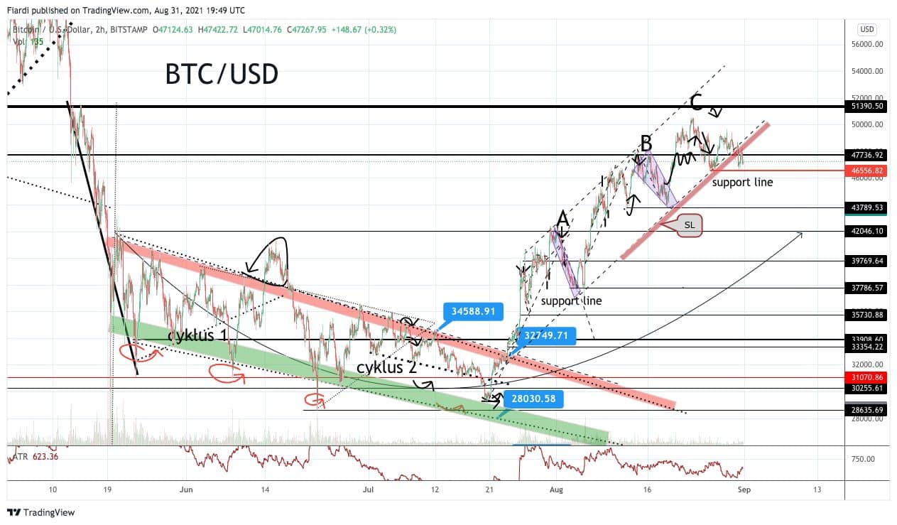 V úterý vidíme propad bitcoinu o 1,2 %. Za propadem můžeme hledat i víkendové neprolomení odporu 51 000 USD. Na grafu vidíme bullish kanál, který nevydržel tlak a propadl pod support line což může signalizovat změnu trendu z bullish na bearish v tom případě sledujeme podpory na 46 556 a následně support hodnoty na 43 000 USD.