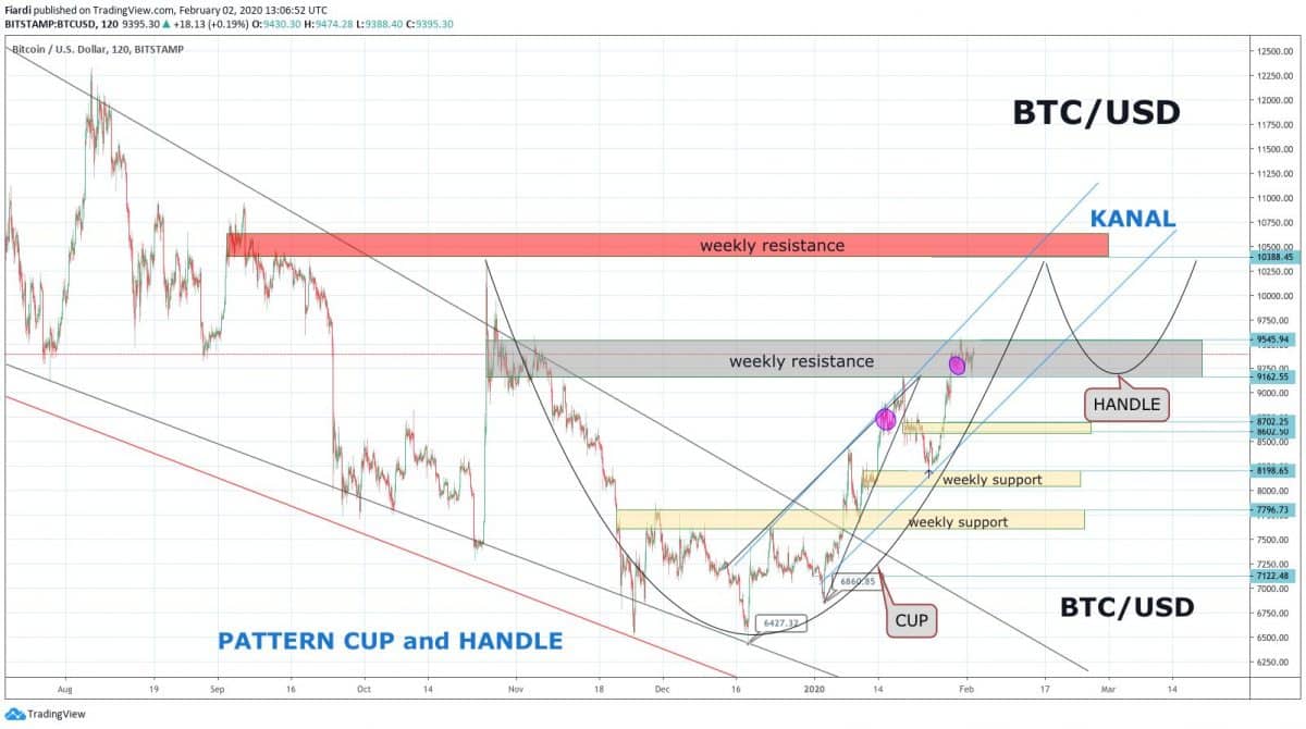 Momentálně vidíme na Bitcoinu vzestupný kanál. Rok 2020 jsme otevřeli na 7 700 USD, dno 6 měsíčního kanálu bylo na 6 440 USD. Od tohoto momentu se Bitcoin stal bullish. Situace připomíná pattern Cup and Handle. Ta první část připomíná kulaté dno, stejný vzor je na Litecoinu, ale můžeme předpokládat, že se to změní na cup and handle.