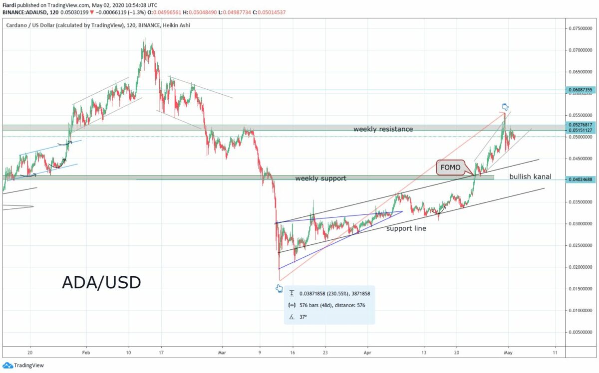Cardano se v sobotu pohybuje na hodnotě 0,05 USD. Pro dnešek vidíme růst o +1,41 %. Momentálně (za rok 2020) je ADA výrazně v plusu, a jak si můžete všimnout, bullish kanál byl prolomen a nastalo FOMO, které přispělo k tak výraznému 230% růstu během 48 dní. Tedy mluvím o růstu od posledního propadu a low hodnot roku 2020 na 0,017 USD. V tomto roce se ADA dostala již na 0,0728 USD (high 2020) a tyto hodnoty se mohou v průběhu roku klidně zopakovat.