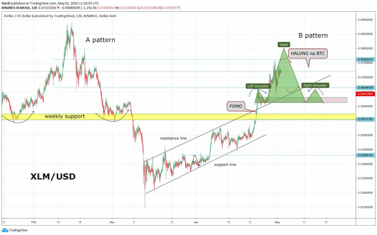 Stellar se momentálně nachází na hodnotě 0,0721 USD. Vidíme weekly support na 0,055 USD. V rámci odporu vidíme hodnoty 0,088 USD z předchozího A patternu. U tohoto patternu i zůstaneme, náhodně podobný vzor A by se mohl přenést i do B verze a vytvořit tak pattern (H & S) hlavy a ramen. V rámci halvingu na BTC bychom i tady mohli vidět 50denní high s následným propadem. I s tímto počítáme u XLM predikcí, kde může nastat B pattern, a můžeme propadnout k 0,0613 USD. Je třeba být velmi opatrný a v příštím týdnu sledovat vývoj na XLM a dokázat rychle reagovat na změny, které mohou přijít. Zároveň vidíme i vzorec chování na BTC, který se dostal nad bullish kanál – tedy nad jeho resistance line podobně, jako je tomu nyní na XLM.