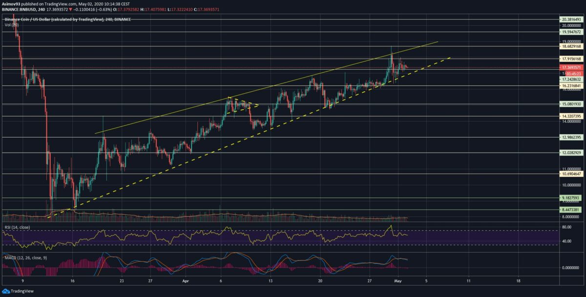 Napřed začneme s trhem BNB, který se (i přes všechny ty pády) docela solidně drží, a když se naskytne šance se vyhoupnout, tak toho využije. Každopádně před sebou máme střednědobý trend, který má docela přesně vymezené hranice. Dolní trendová přímka sice není dokonalá, ale řekl bych, že je, vzhledem k price action, dostatečně relevantní. Horní hrana ztělesňuje samozřejmě rezistenci, díky které se volatilita kurzu soustavně snižuje.