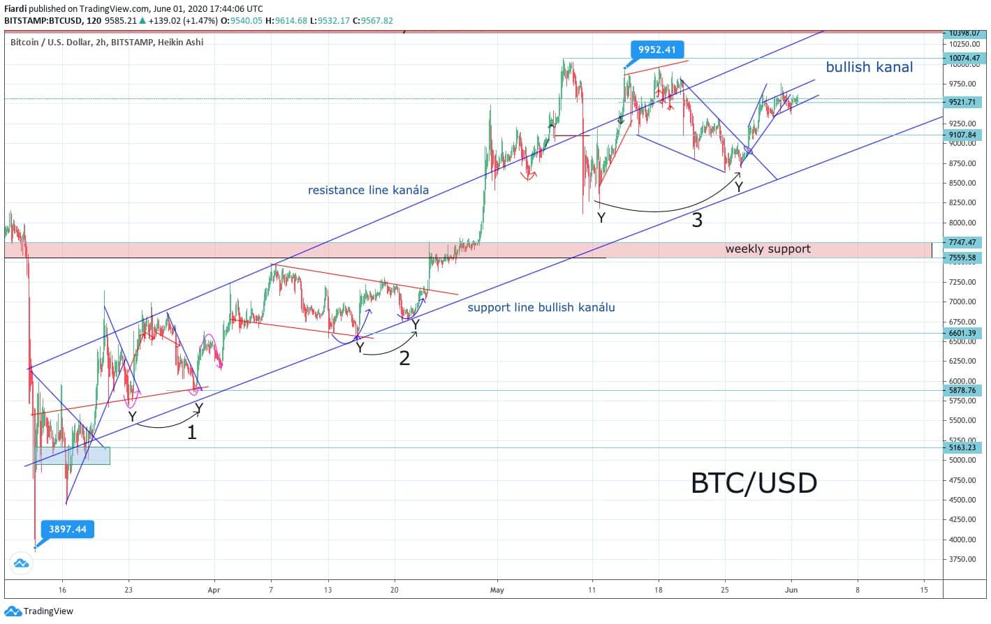 Bitcoin včera tvořil pouze malý pohyb. Držíme se stále nad 9 500 USD od prolomení trianglu na 8 900 USD. První den v týdnu obvykle tvoří jen malý pohyb a postupně se to stupňuje. Nejbližší odpor vidíme na 9 600 USD a podporu vidíme na 9 150 USD. Stále zůstáváme pozitivní a díváme se na nejbližší hodnoty odporu. Pokud bychom v úterý prolomili 9 700 USD, budeme koncem týdne bojovat o prolomení 10 000 USD.