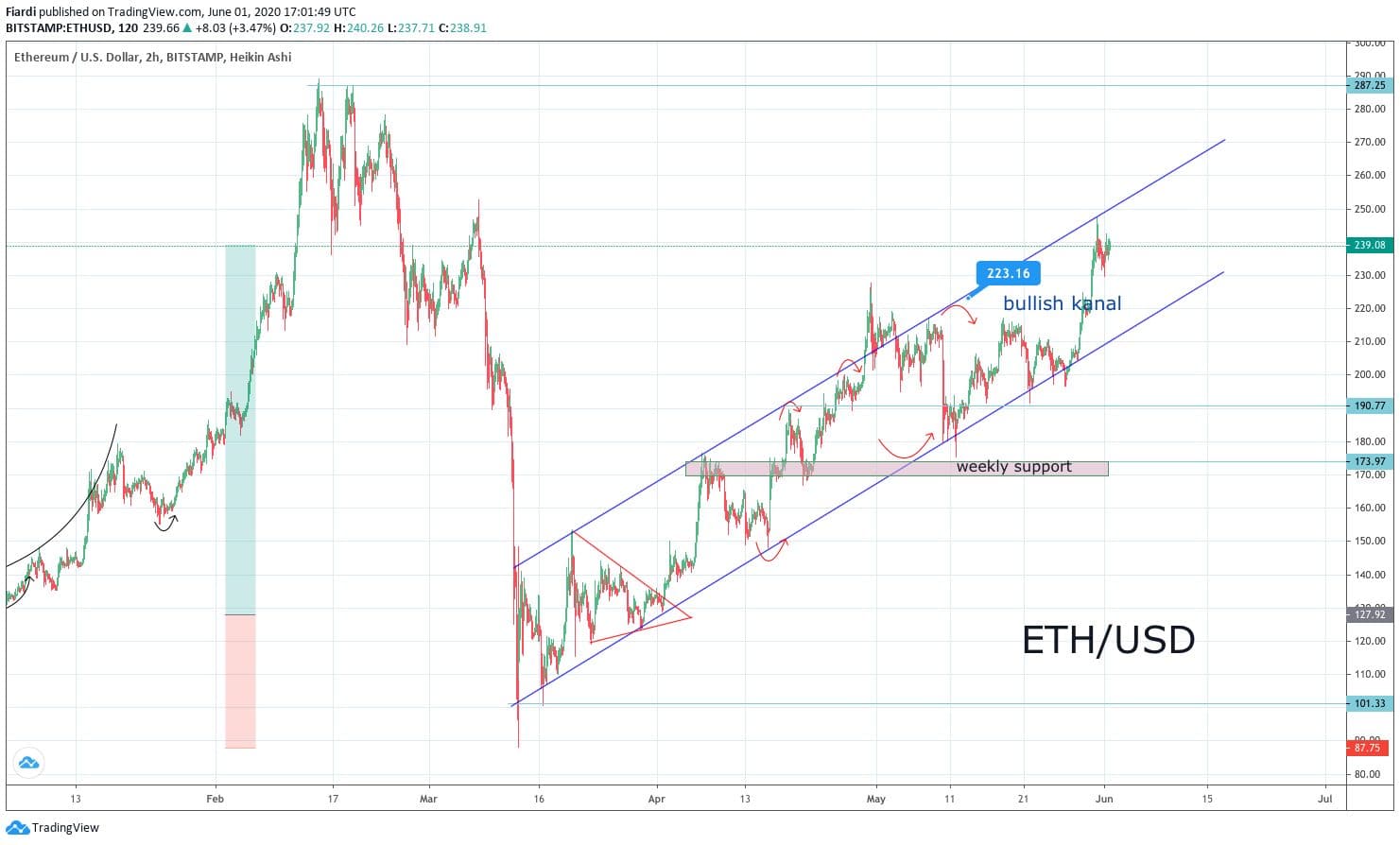Ethereum se zcela jistě stává trhákem roku 2020. Jeho zhodnocení o 86,9% za rok 2020 je určitě nadprůměr. Investoři hledají jistotu i v momentálním bullish kanálu. Pohybujeme se na hodnotě 239 USD a jak vidíme na grafu, podporu hledáme na spodní straně kanálu. Odpor naopak bude tvořit vrchní strana bullish kanálu. V růstu by mělo Ethereum pokračovat až k 260 USD a pomoci mu může propagace ETH 2.0 a pozornost médií, která se mu dostává.