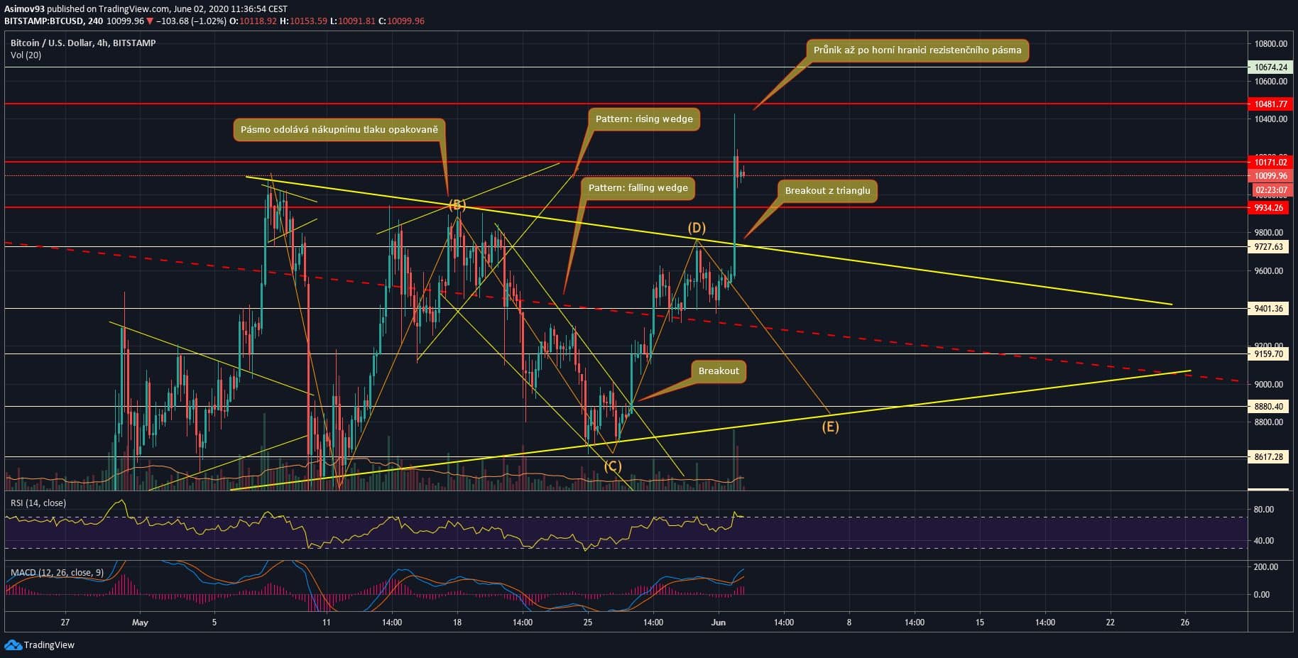 Trhu se povedly tedy dvě zásadní věci. Ta první je, že máme breakout z toho skoro měsíc tvořícího se patternu. Ta druhá jest překonání psychologické úrovně 10 000 USD. Nicméně, nejdůležitější věci se ještě nestaly a to je právě průraz rezistence v levelu 10 481 USD a vymanění trhu z toho mohutného trianglu z prvního grafu.