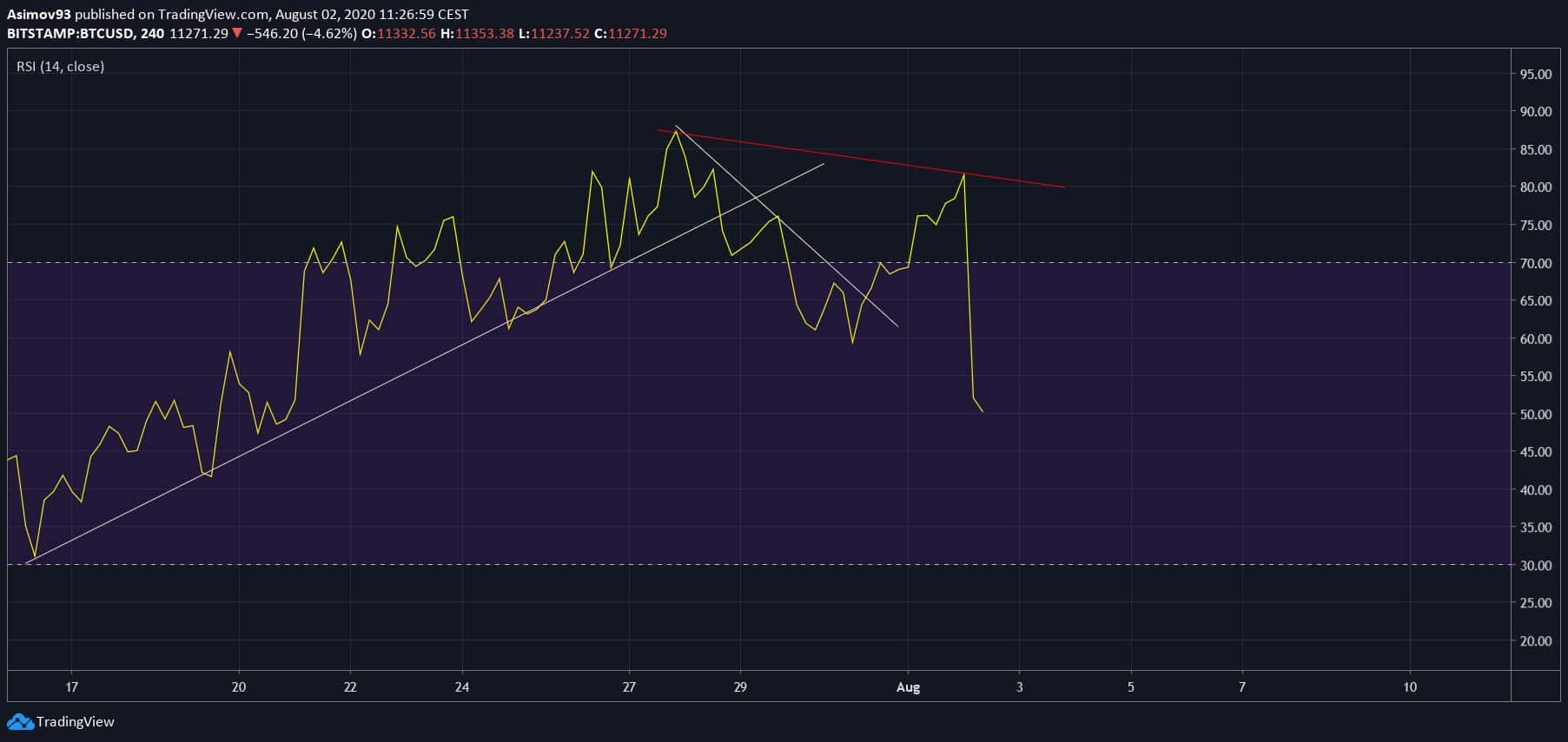 Na RSI indikátoru byla středně velká medvědí divergence a ta díky tomu dumpu slušně uplatnila. Ovšem skoro stejná anomálie byla i na 12H časovém rámci. Denní časový rámec je přepálený, ale tam se zatím dařilo udělat vyšší vrchol. Nezapomínejte, že na čím více časových rámců jsou divergence, tak tím větší sílu to při uplatnění má.