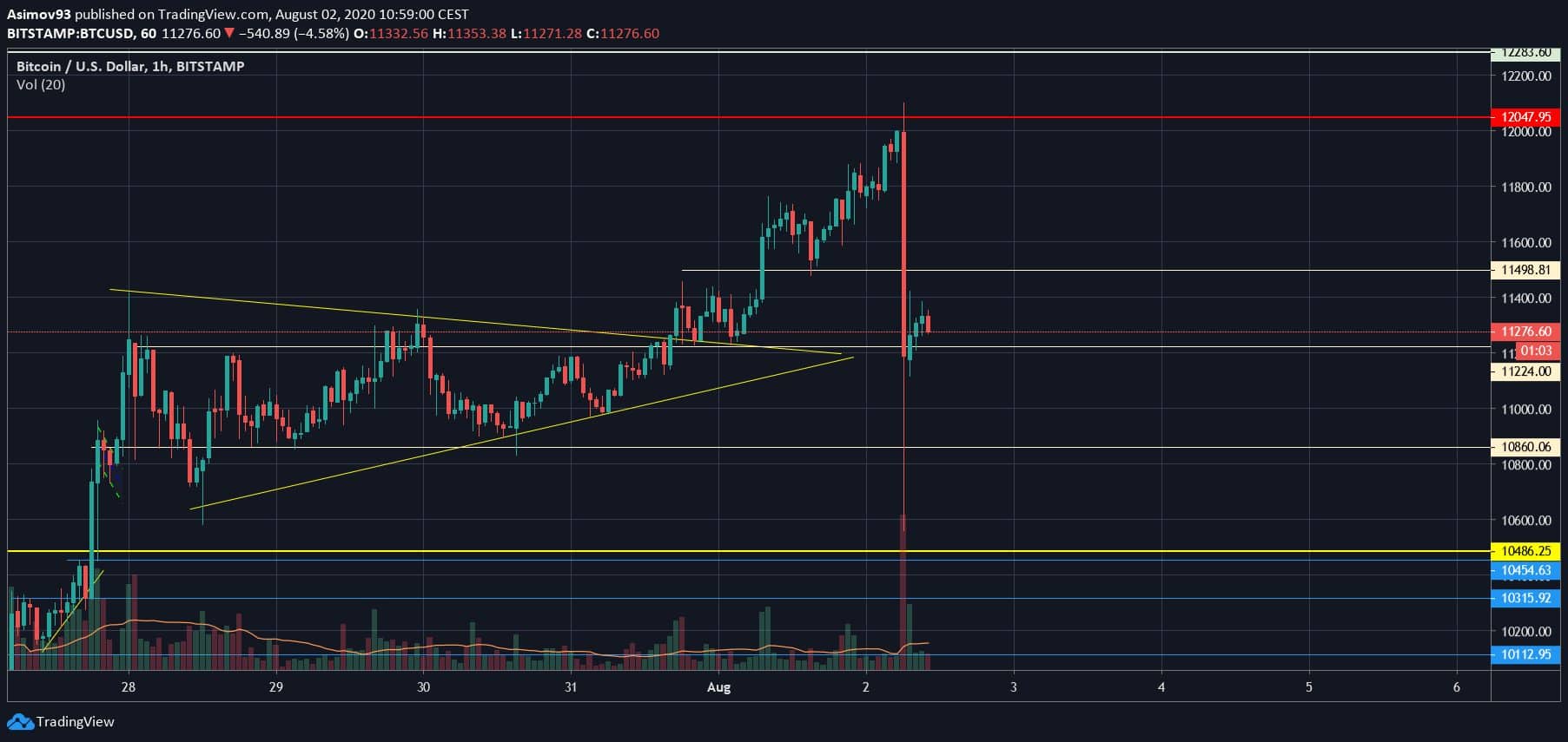 Pro lepší přehled přidávám i graf s hodinovým časovým rámcem, kde jde alespoň trochu vidět, co se vlastně právě teď na trhu děje. Je zřetelné, že se bojuje o S/R level 11 200 USD. Vlastně se zde rozhoduje o tom, jestli dojde k té mnou avizované korekci nebo zapůsobí zase FOMO a otestujeme znova těch 12 000 USD.