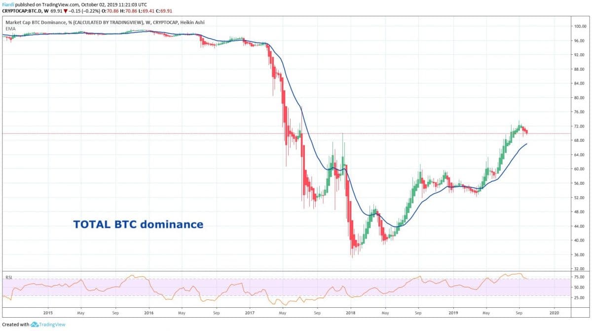 Při pohledu na graf můžete zase vidět total market cap BTC. I na tomto grafu vidíme blízký weekly support na hodnotách 60%. Můj osobní názor je ten, že se blížíme k rozhodující fázi toho, kam se celý trh nasměruje.