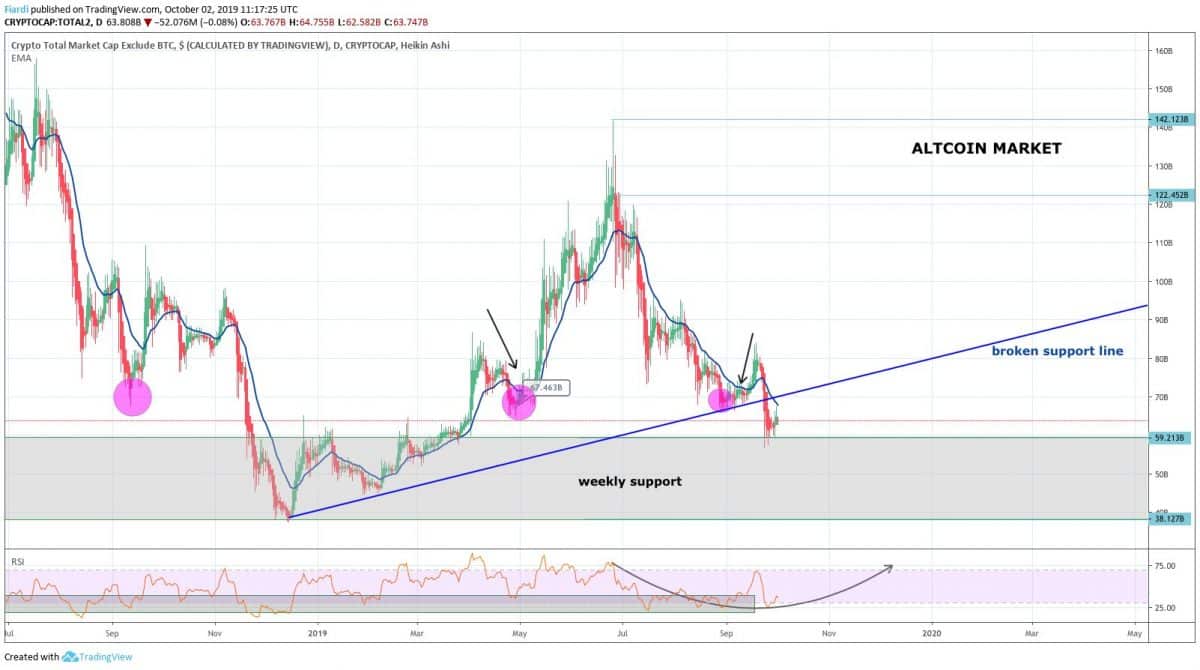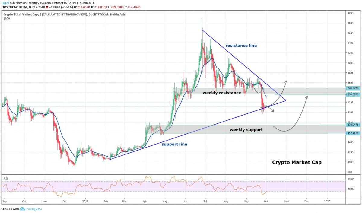 Situace není dobrá, prázdniny se postaraly o to, že altcoiny výrazně oslabily. Během léta se vymazalo 176 mld. USD (top na 388 mld. USD) což představuje 45,52% propad. Co je ještě horší, momentální situace na trhu stále nevypadá příznivě. Při pohledu na graf níže můžete vidět, že se momentálně nacházíme na support line trianglů velkého kanálu. Momentálně hodnoty na 211 mld. USD by mohly být vážným kandidátem na odražení směrem nahoru.
