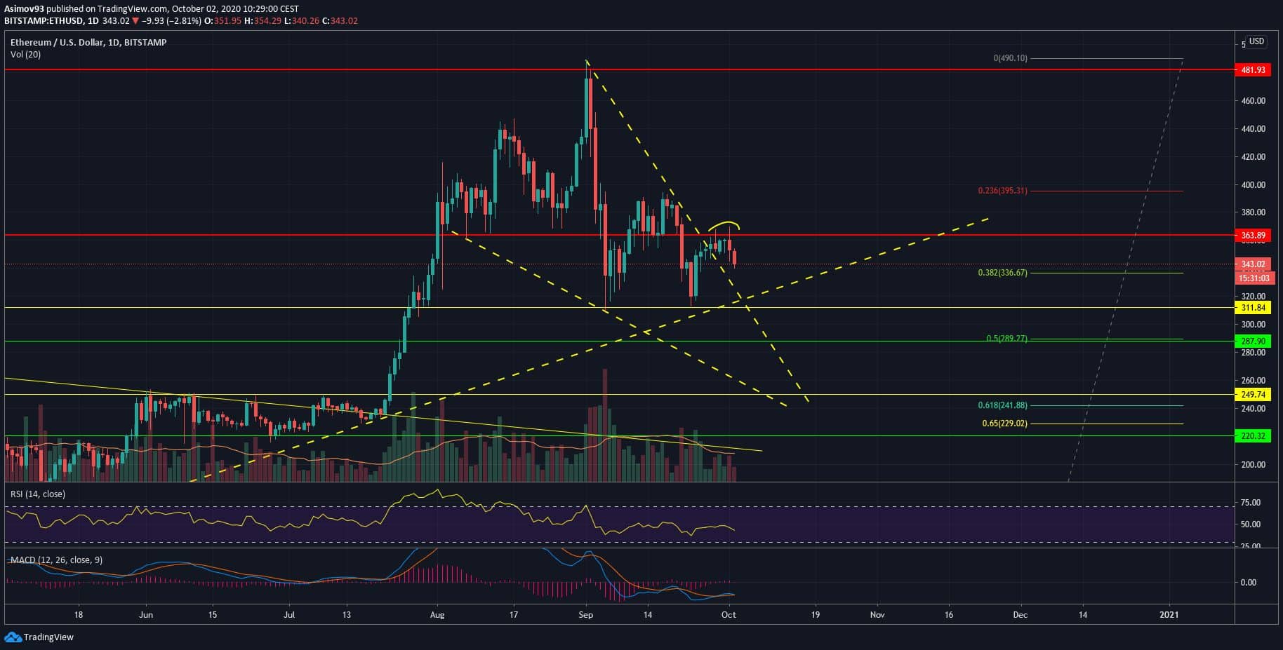 V dnešní analýze se soustředíme hlavně na denní časový rámec, abychom měli v podstatě makro přehled o celém dění. Ta struktura trhu měla podobu falling wedge, ze kterého kurz prorazil. Pomohlo tomu samozřejmě dvojitý odraz od supportu na cca 312 USD. Kdyby někdo bloumal nad tím, že jsou občas zmiňovány odlišné úrovně, tak se většinou jedná pouze o přibližné číslo.