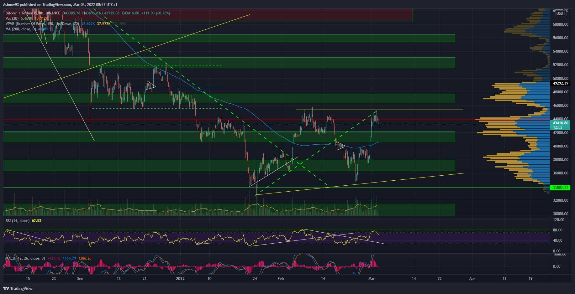 To zamítnutí na 45 000 USD bylo docela razantní. Když bychom si celou situaci v grafu hodně přiblížili, tak uvidíte, že nabídka postup naprosto zastavila. Leč postup kurzu se ihned zpátky neobrátil, pořád byla tendence pokračovat vzhůru. Nakonec můžete ale sledovat, že dochází k postupné rotaci, což nás asi dovede na S/R level 42 000 USD.