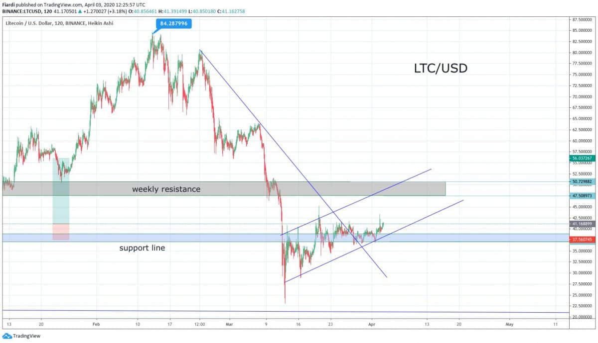 Momentální podporu vidíme na hodnotách 37 USD. Nejbližší odpor máme na 43,86 USD. Na grafu vidíme vzestupný kanál, který se po odrazu na letošním low 23,5 USD ještě stihl odrazit do krátkého bullish kanálu. O víkendu jsme viděli pokles trhu, který se nevyhnul ani Litecoinu. Momentálně vidíme růst na weekly support, od kterého se dnes odrazil mírně nahoru. Pohyb je ale tak malý. Tato situace zřejmě více vyhovuje bulls, kteří se snaží přečkat tento čas, kdy se svět zmítá pod nákazou COVID-19. Aktuální odpor vidíme na hodnotě 41,5 USD.
