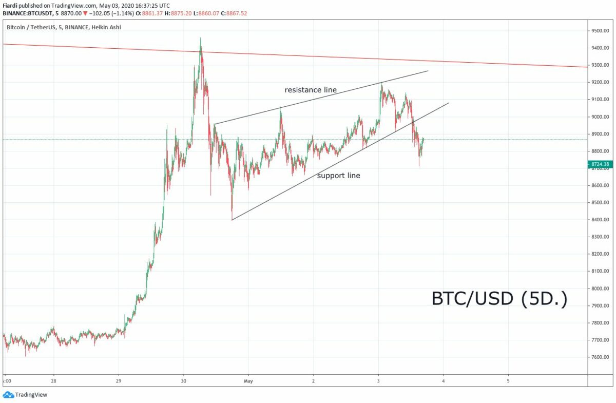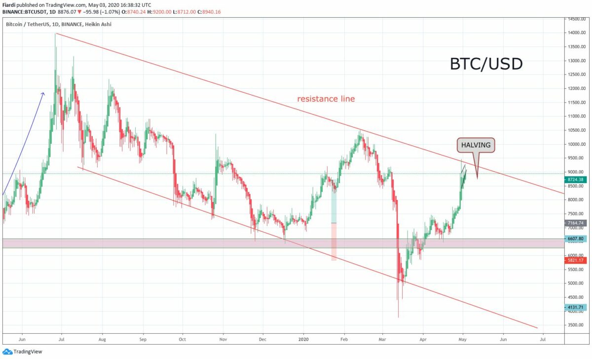 No a teď bubák! Důvod proč se analytici liší ve svých analýzách na long, či short je tento graf výše. Bullish kanál, který zde máme 2 měsíce je schovaný v téměř ročním bearish kanálu a právě hodnoty 9 450 (které jsme před pár dny viděli) narazily na resistance line bearish kanálu a bears to poslali prudce dolů o 950 USD. Mnozí analytici proto predikují, že do halvingu už nad 9 450 USD nepůjdeme a po halvingu naopak znovu spadneme. Samozřejmě je to jen názor jednoho tábora a nejde o názor obecný. Propad (stejně jako i růst) je cílem spekulace.