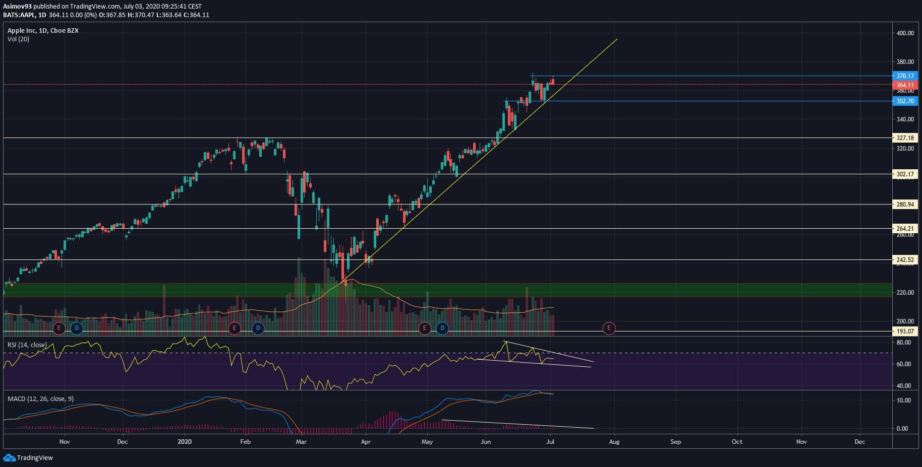 Od březnového low po aktuální historické maximum vzrostla cena akcií Applu o nějakých 75 %, takže aktuální cena dělá 364 USD. Máme před sebou typickou uptrendovou strukturu, která zatím nejeví žádné známky problému.