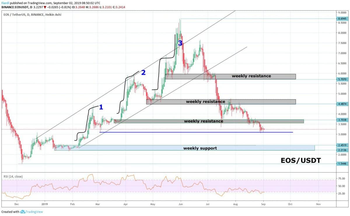 Momentální scénář u EOSu vidím na propad k 2,45 USD. Pokud momentálně výrazně neporostou altcoiny, Bitcoin bude dominovat kryptotrhu a dostane se nad 70 %.
