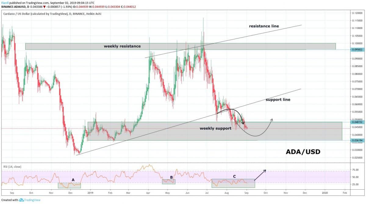 Podíváme se dnes i na graf ADA. Jak můžete vidět, na grafu mám zakreslen kanál, který bohužel ADA neudržela a hodnota této kryptoměny propadla na současnou cenu 0,044 USD. Tedy přesně do weekly supportu, který má však velmi silnou základnu na 0,048 – 0,036 USD.