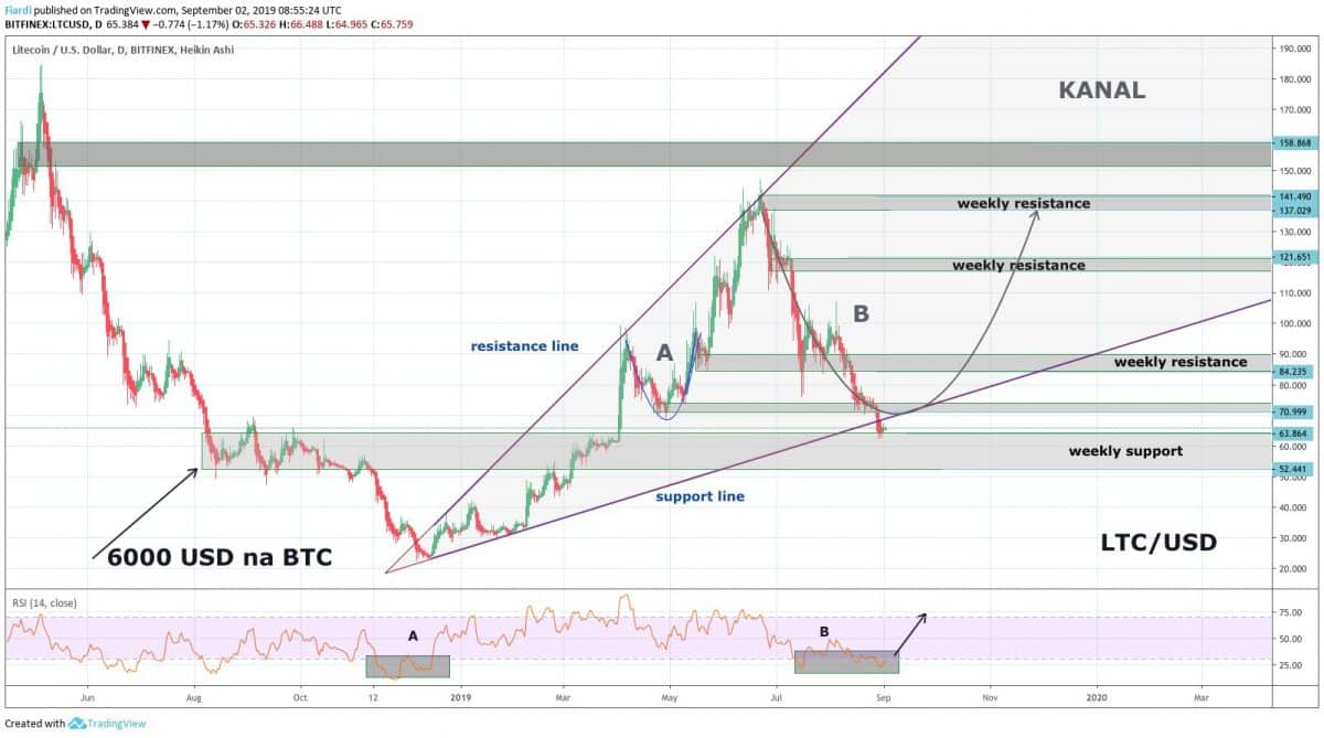 Na hodnotách 63 USD začíná weekly support (podpora), který by měl propad LTC minimálně zpomalit nebo úplně zastavit. Otázkou zůstává, zda uvidíme u LTC konsolidaci před růstem, nebo rovnou tvrdý odraz směrem vzhůru?!