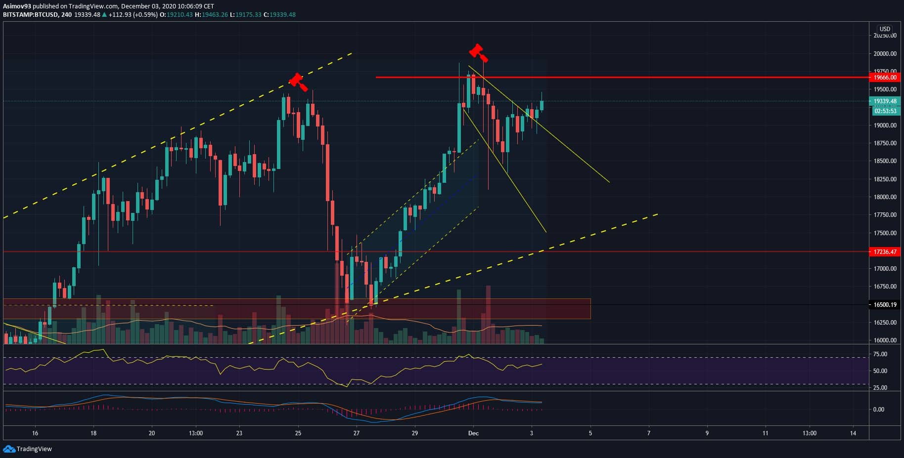 Na 4H grafu lze snadno zaregistrovat dvě vcelku přesvědčivá zamítnutí pod 20 000 USD. Medvědi tím dali jednoznačně najevo, že cena nahoru nepůjde. Býkům jsou evidentně medvědí snahy ukradené a po krátké pauze se kurz zase tlačí k 20 000 USD. Uvidíme třetí zamítnutí? Těžko říct, ale pokud k němu dojde opětovně, tak by to pro trh mohl být jasný signál ke korekci.