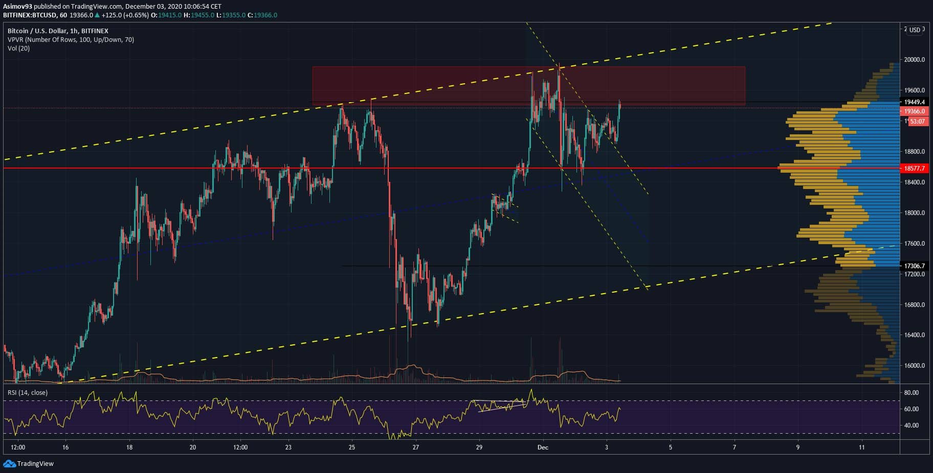 Na hodinovce můžeme vidět celou aktuální situaci podrobněji. Dá se říct, že celý cenový interval 19 400 USD – 20 000 USD je odpor. Avšak cena má nepochybně tendenci na rezistenci znova a znova útočit, což není za těchto podmínek nic překvapujícího. Nakupující jsou prostě nesmírně agresivní a ochotni riskovat, čímž se bull run vyznačuje.