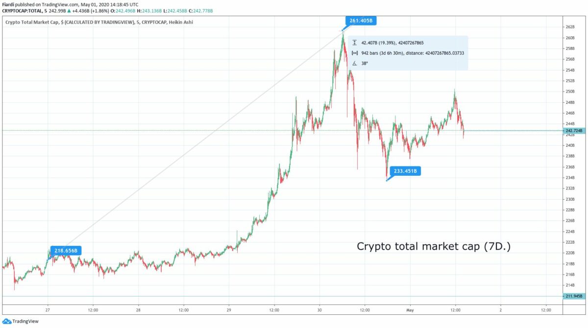 Včera jsme se dostali na hodnotu marketcapu 252 mld. USD (+6 mld. USD za 1D.), což je propad od high 2020 o 54 mld. USD. V tomto týdnu zaznamenáváme low na hodnotě 220,15 mld. USD a high na 263 mld. USD. Bitcoin vzrostl z 7 610 USD na high 9 450 USD (7D.). Momentálně se pohybujeme na 8 990 USD. Dominance Bitcoinu se ustálila na 65,5 %.