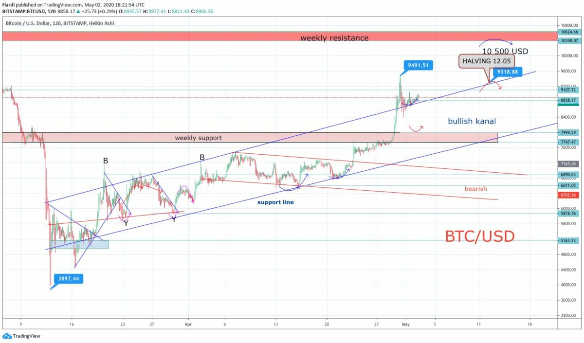 Do halvingu zbývá 10 dní a o víkendu se ví, že je to během něj takové zpomalené a nebývá tam většinou žádný velký rozptyl. V neděli nám toho Bitcoin napoví víc, je to den před otevřením světových trhů. Ale i ten včerejší růst k 9 000 USD nám naznačuje, že by Bitcoin mohl mít znovu sílu růst opět minimálně k 9 450 USD, kde se ještě před pár dny nacházel. Na grafu vidíme růst na vrchní straně resistance line na vrchu bullish kanálu. Tato pozice je klíčová k tomu, aby investoři našli ve svých řadách v příštím týdnu znovu někoho, kdo to pošle během pár hodin o 10 % výše, než byla hodnota v posledních 3 týdnech. Zdá se, že to má Bitcoin dobře rozjeté a do halvingu můžeme čekat hodnoty kolem 10 000 USD.