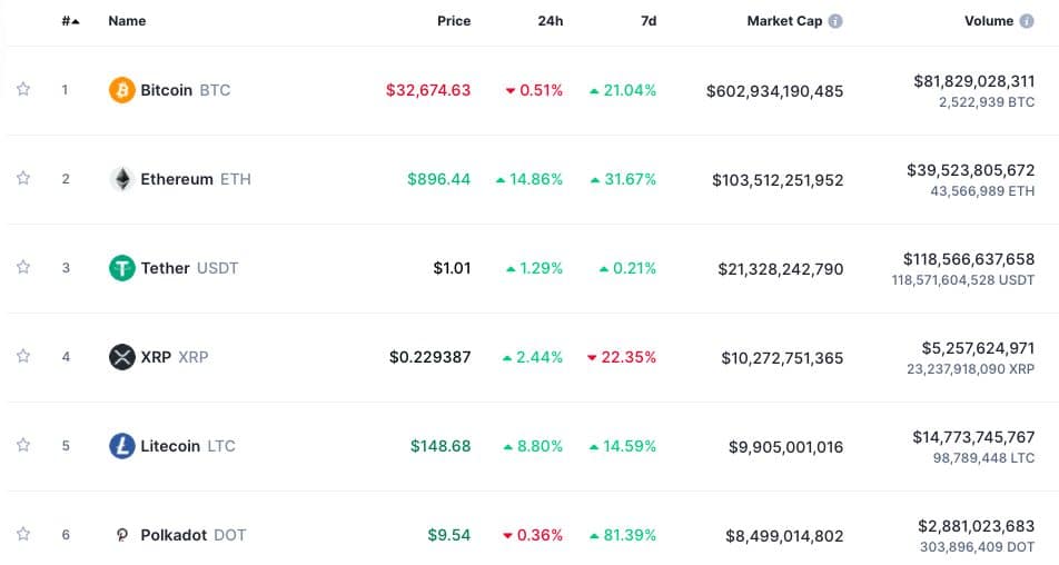 Včera jsme se dostali na hodnotu marketcapu 862 mld. USD. V tomto týdnu zaznamenáváme low na hodnotě 805 mld. USD a high na 887 mld. USD. U Bitcoinu máme za stejné období low na 31 250 USD a naopak high BTC vidíme na 34 530 USD. Momentálně se pohybujeme na hodnotě 32 700 USD za jednu BTC minci. Dominance Bitcoinu je na hodnotě 70,4 %.