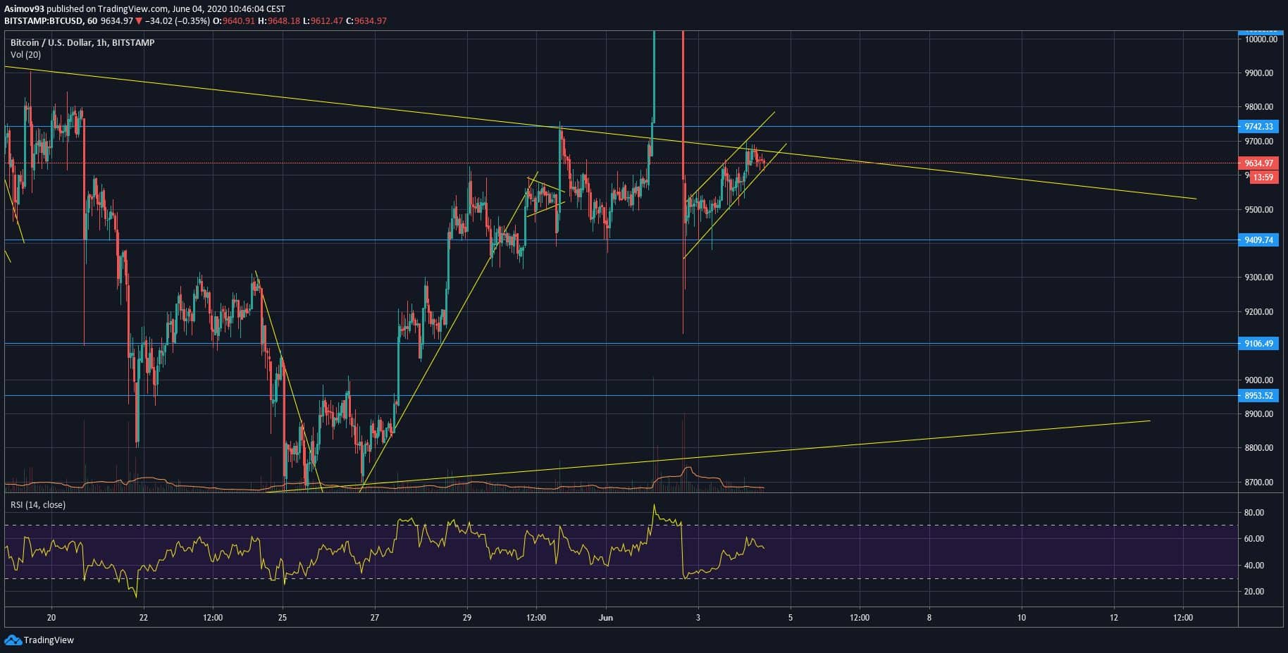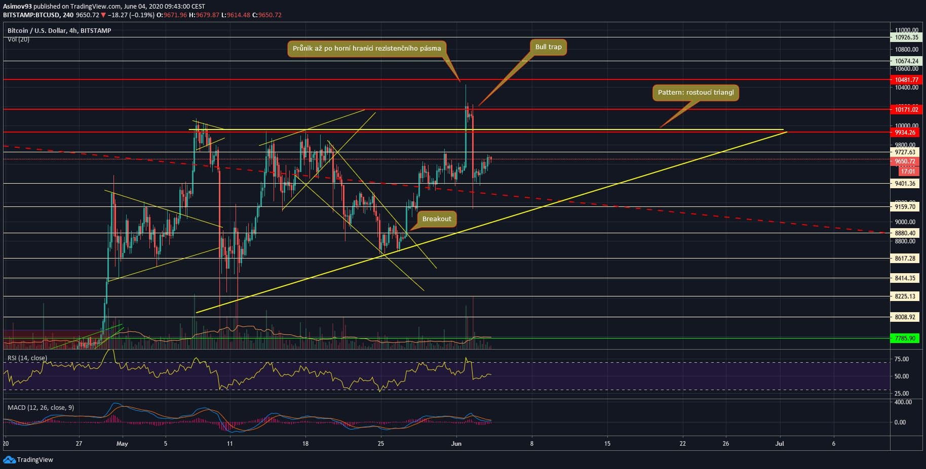 Co je nejdůležitější, tak oproti minulé TA jsem pattern překreslil. Více mi teď dává smysl rostoucí triangl, ale uznávám, že to není zcela asi akurátní. Kurz po odrazu od zmíněné úrovně postupně povyrostl až k levelu 9 727 USD, ale spíše se mi zdá, že trh bude chtít vyklesat ke spodní stěně patternu.