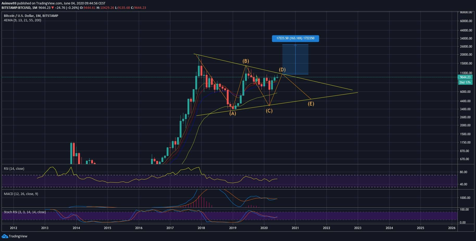 Jenom pro připomenutí přikládám měsíční graf, kde vidíme, že začátek výprodeje začal hned u horní hrany zakreslené struktury. Tudíž je potřeba mít na paměti, že je před těmi 10 500 USD je silný odpor, ale zároveň tu platí jako rezistence i horní hrana dva a půl roku tvořícího se trojúhelníku.