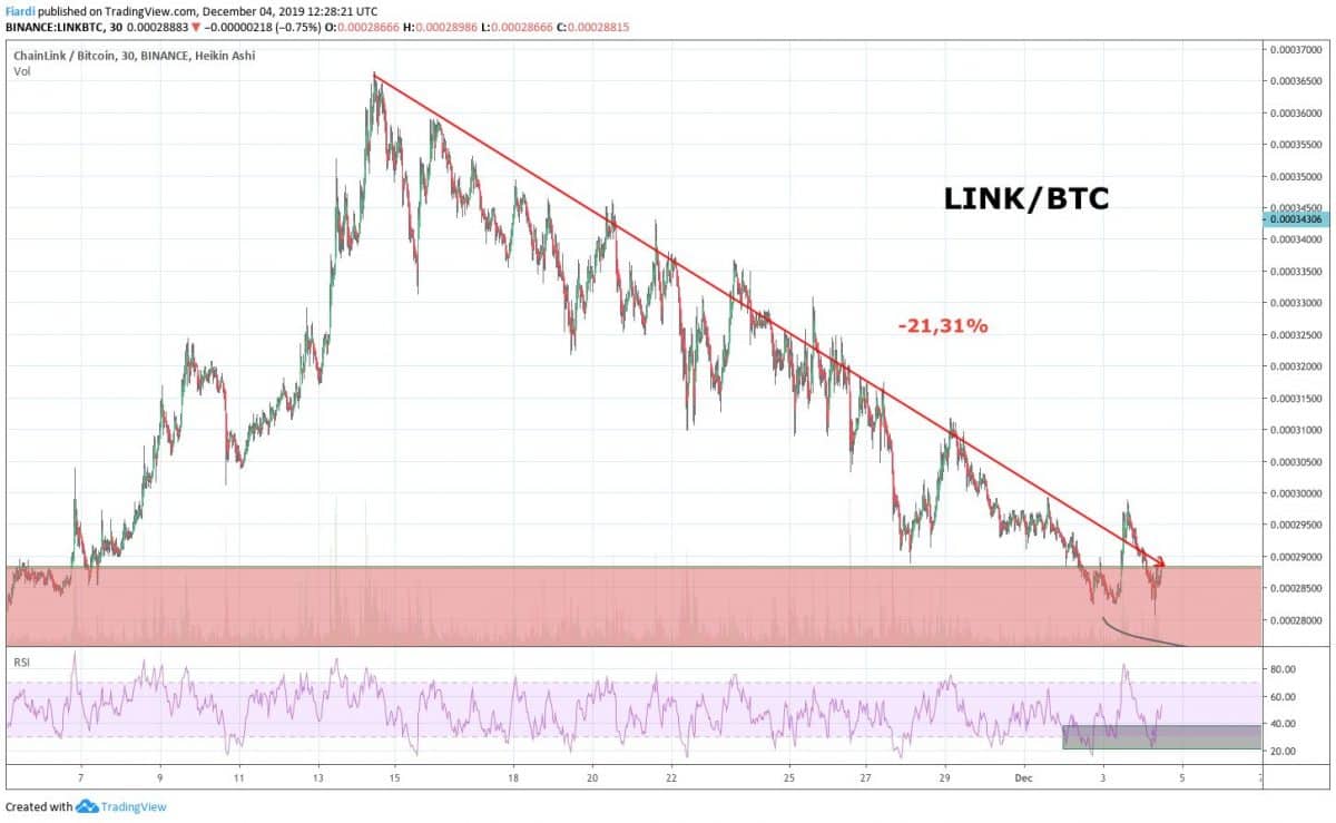 Při pohledu na graf sledujeme RSI indikátor, který hlásí buy zónu přesně na odrazu vrchního supportu a zároveň také linie trendu na grafu LINK / BTC. Spolu s RSI to jsou až 3 ukazatele podpory pro příští možný odraz směrem nahoru.