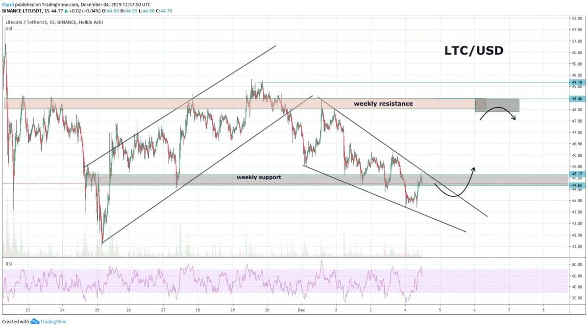 Od včerejšího otevření na 45,47 USD se cena Litecoinu dnes snížila o 1,6 % a na nejnižší úrovni dosáhla 43,71 USD. Cena se v současné době obchoduje na úrovni 44,75 USD poté, co se vrátila na úroveň weekly supportu.