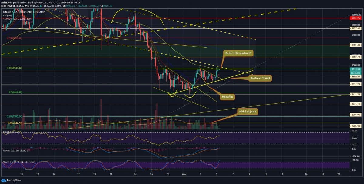 Tím se vlastně vytvořilo double bottom a následoval odraz up a to až těsně nad úroveň 8 880 USD, ale stejně jako 27. února následovalo zamítnutí. Až do včerejška cena mírně klesala, až vytvořila bullish pattern tzv. megafón. Z něj nakonec kurz hezky pumpnul a tím se dostal zase tam, kde již dvakrát došlo k zamítnutí.