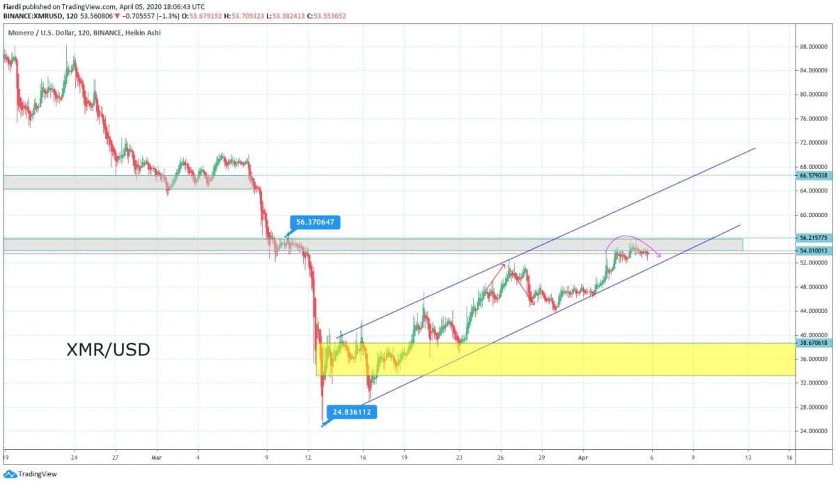 Monero je jeden z mála coinů z top 100 kapitalizace, který je ještě v roce 2020 v plusu. Momentální hodnota je 54 USD a na grafu vidíme rostoucí kanál, který ho dovedl na 54-56 USD odpor. Těžko říct, jak to bude vypadat na Bitcoinu, protože tomu se nedaří prolomit 7 000 USD.