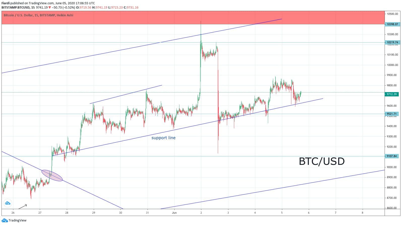 Bitcoin se včera držel na hodnotě 9 740 USD. Jak vidíme na grafu, odrážíme se na support line směrem k hodnotám odporu na 10 000 USD, který začíná být velkým problémem. V rámci podpory vidíme hodnoty 9 500 USD a po prolomení 9 100 USD. O víkendu neočekáváme velký pohyb Bitcoinu a rozptyl možná o 200-350 USD. Více nám toho napoví neděle večer.