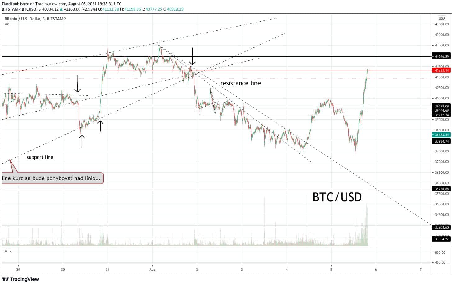 Bitcoin se čtvrtek večer pohybuje na 41 000 USD. V rámci grafu vidíme vyšší highs a hodnoty odporu na 42 000 USD. Pokud tyto hodnoty Bitcoin neprolomí, může spadnout k 36 000 USD, kde jsou nižší lows. V rámci vyšších highs musejí investoři prolomit 42 000 USD odpor, aby mohly růst pokračovat k 48 000 USD, kde je nejbližší odpor. Poslední dny na Bitcoinu vidíme velké volume a pohyb, kdy investoři nechtějí rychle přes 42 000 USD.