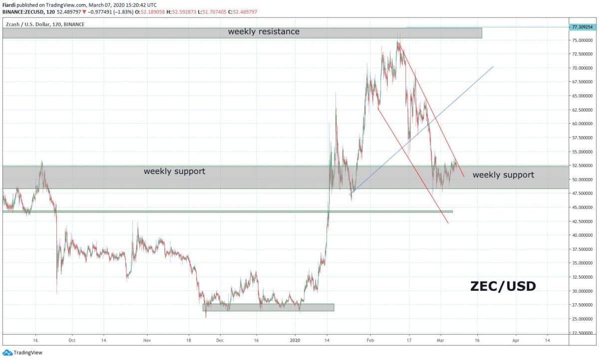 Zcash se v roce 2020 zatím těší slušnému úspěchu. Momentálně, i přes ten propad trhu, si stále drží 90% růst hodnoty v aktuálním roce. V současné době jsme se odrazili od supportu při hodnotě 48 USD a ZEC má další prostor k růstu na 60 USD, kde vidíme mírný odpor. Samozřejmě tvrdý odpor vidíme na letošním high na 75 USD.