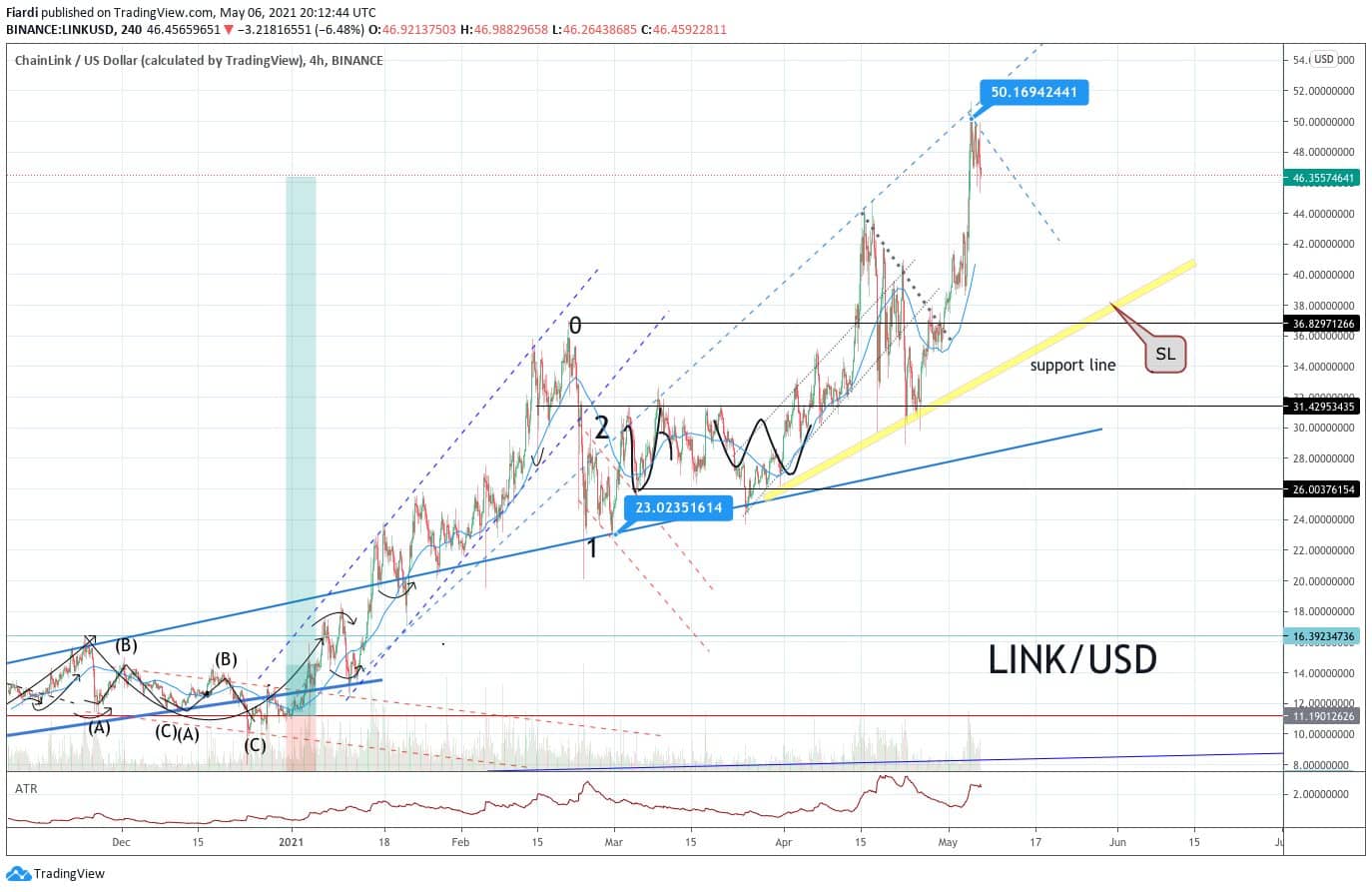 Chanlink vytvořil nové ATH na 50 USD. Po menší přestávce kanálu do strany, přechází na to, co ho zdobilo poslední 2 roky. Střídání bullish a bearish kanálů nehledě na vývoj Bitcoinu. Prudký růst na 50 USD je způsoben i aktivitou developerů, kteří se znovu pustili do díla a podepisují spolupráce s menšími DeFi projekty. Následující dny by mohl poklesnout a vytvořit menší bearish kanál, no z předchozí fraktální podobnosti je jasné, že se na hodnoty 50 USD vrátí co nevidět.