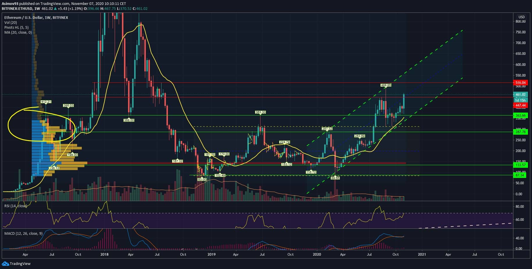 Na týdenním grafu lze moc dobře zpozorovat, že volume area high na volume profile zanfungoval jako support. Já bych si proto dovolil tvrdit, že Ethereum se už tak lehce pod 300 USD nedostane. Celá ta cenová relace mezi 300 USD – 110 USD je zabetonovaná. Nevím, co by se muselo strašně pokazit, že bychom šli níž. Já tomu proto šance vůbec nedávám.