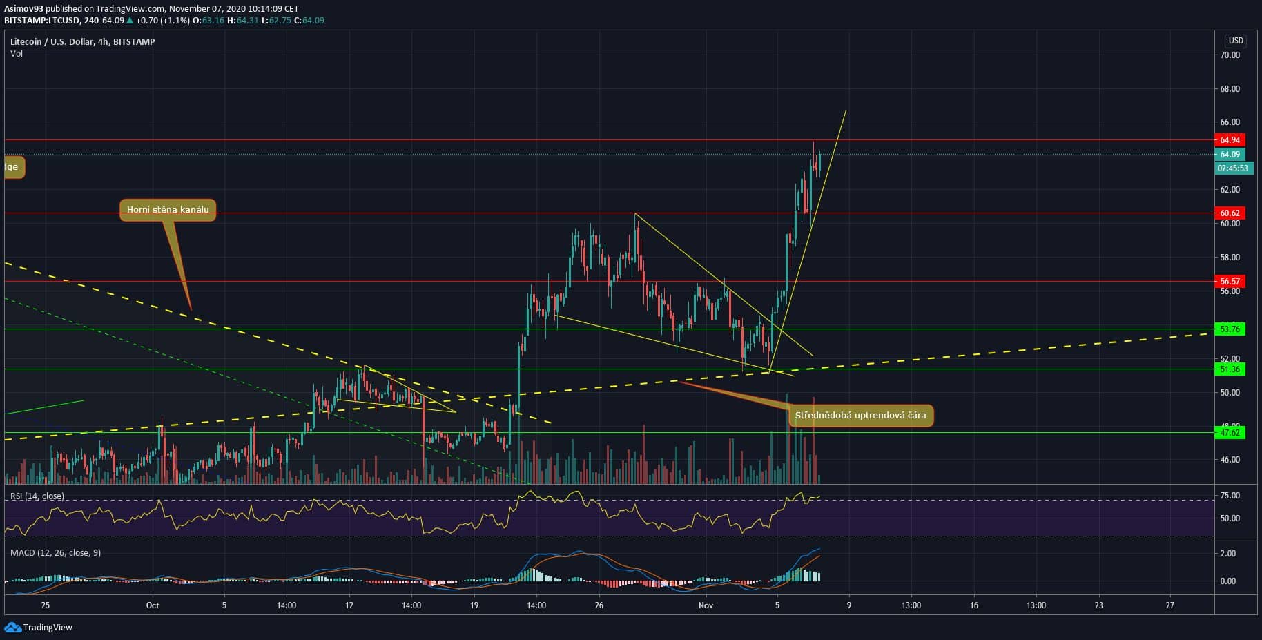 I kdyby ještě Litecoin vzrostl na 70 USD, tak i přesto je korekce až po těch cca 40 USD naprosto reálná. Co se týče makro pohledu na trh, tak se kurz samozřejmě nevymanil z té bearish struktury. Na to je potřeba prorazit skrze tu rezistenční trendovku. A pokud se na BTC nic razantně nepokazí, tak k tomu průrazu může do několika týdnů dojít.