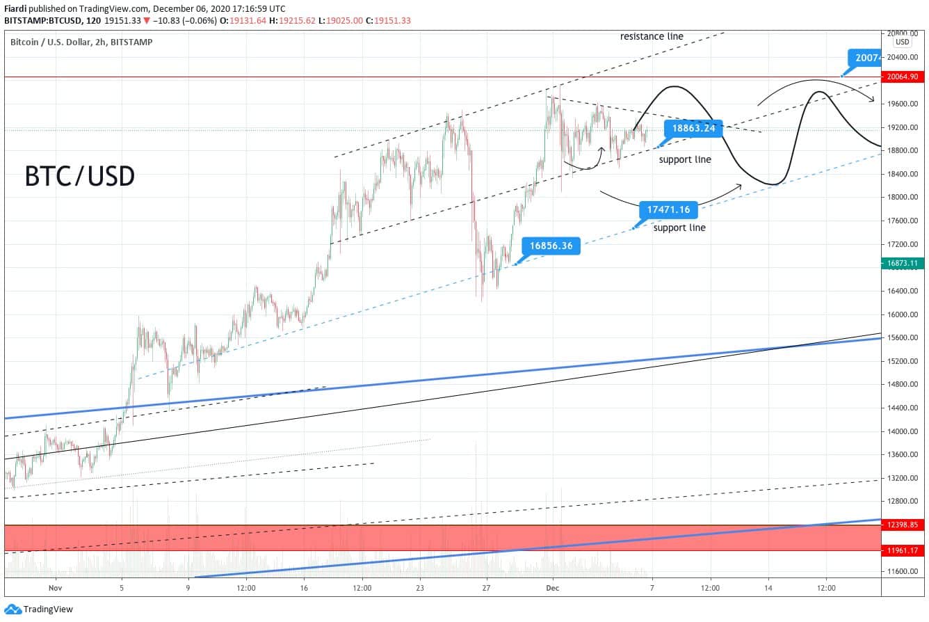 Momentálně se nacházíme na hodnotě 19 200 USD. Jak vidíme na grafu se vytvořil trendový pattern rostoucího kanálu kde vidíme rovno až 2 podporné linie. První podporou je linie na hodnotě 18 800 USD. Spodní strana kanálu tvoří podporu na hodnotě 17 400 USD. Odpor tvoří vrchní stranu kanálu na 20 000 USD. Dříve či později tento bullish kanál nebude prolomen tak tato hodnota musí být prolomená. Otázkou je zda to investoři stihnou ještě v roce 2020 nebo si to nechají na ten nový. Růst Bitcoinu ale nepolevuje a toto je snaha investorů konsolidovat se těsně pod 20 000 USD na případný útok nahoru.