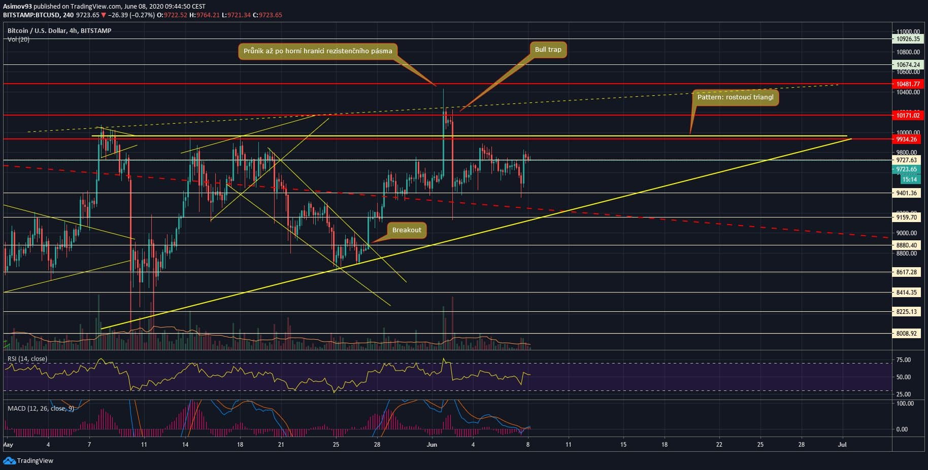 Tak právě došlo k vylití kurzu z toho malého býčího praporku na hodinovém časovém rámci. Nevadí, protože se tím až tak moc nemění. V současnosti asi stačí sledovat několikrát zmiňovaný S/R level 9 401 USD a pak samozřejmě horní hranu mnou zakresleného triagnlu, kde je i spodní hranice rezistenčního pásma 9 934 USD – 10 481 USD.