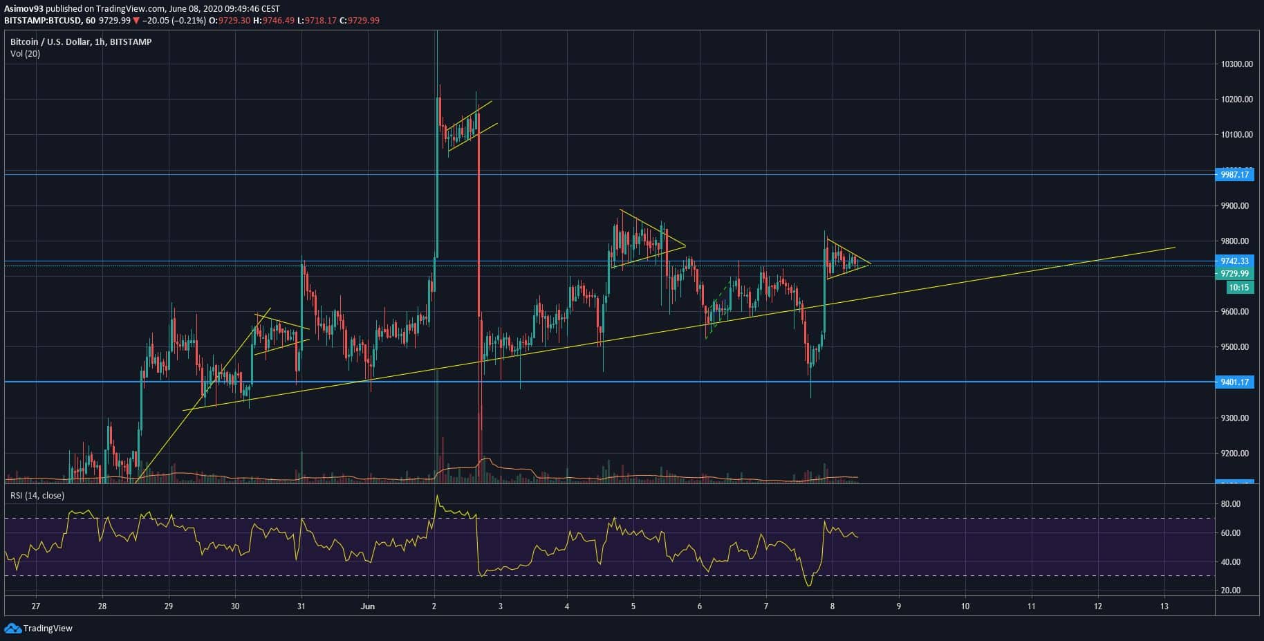 Když se podíváme ještě na nižší časový rámec jako je ten hodinový, tak lépe vidíme, jak support drží. Hladina 9 400 USD drží fakt jako skála už deset dní a pokaždé, když se sem cena dostane, tak dojde k zvýšení nákupního tlaku. Během toho výprodeje z 2. června se sice povedlo na malý okamžik podporu prorazit, ale jak už jsem říkal výše, tak propad nakupující okamžitě vykoupili.