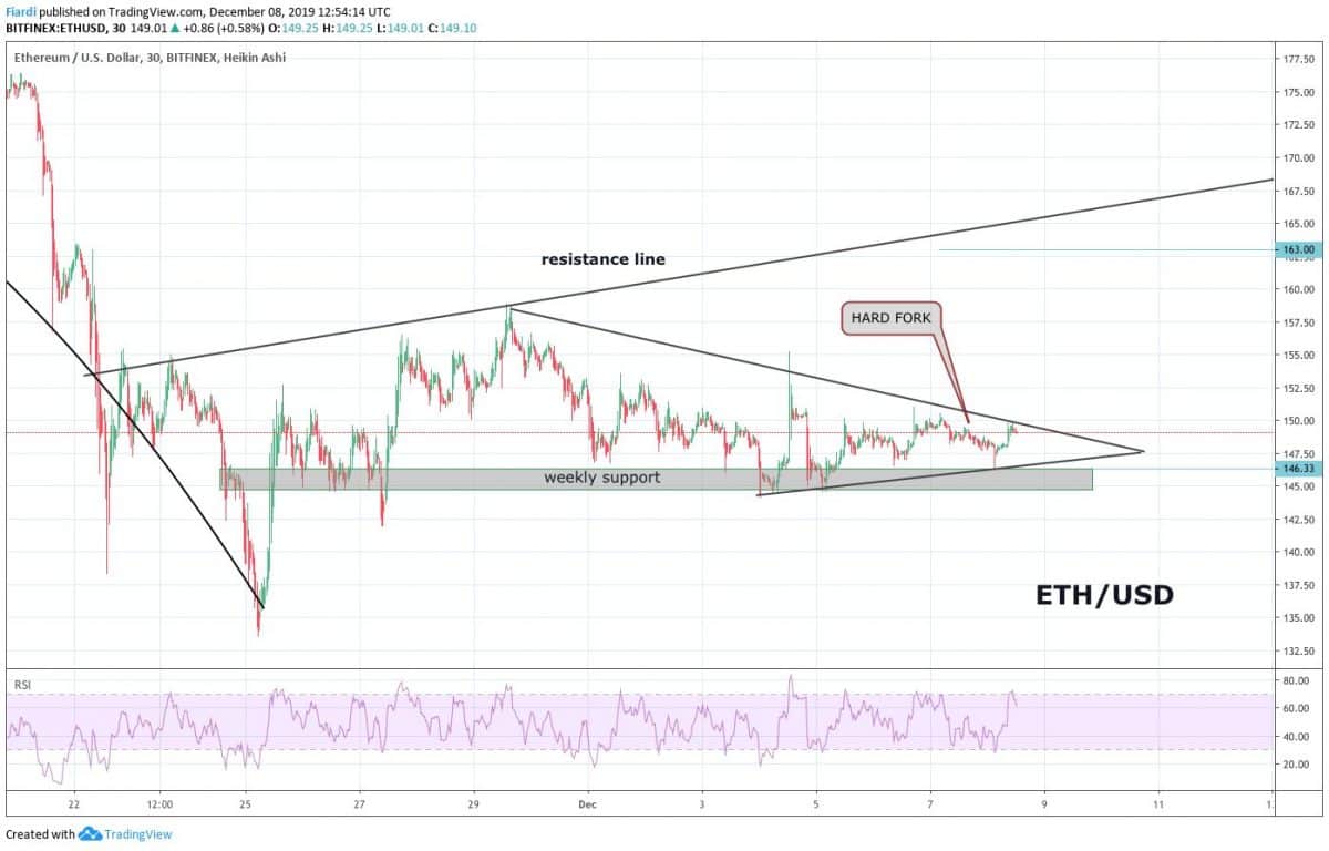 Cena ETH se snaží vytěžit z momentálního Istanbul Fork, odpor vidíme na 152 a 158 USD. Cena v současné době drží hlavní oblast podpory na 144 USD. Ve čtyřhodinovém grafu ETH / USD existuje klíčový triangl, který se pohybuje kolem 150 USD. Ukončení trianglu by mohlo značit silný pohyb vzhůru, jakmile překročí 152 a 158 USD.