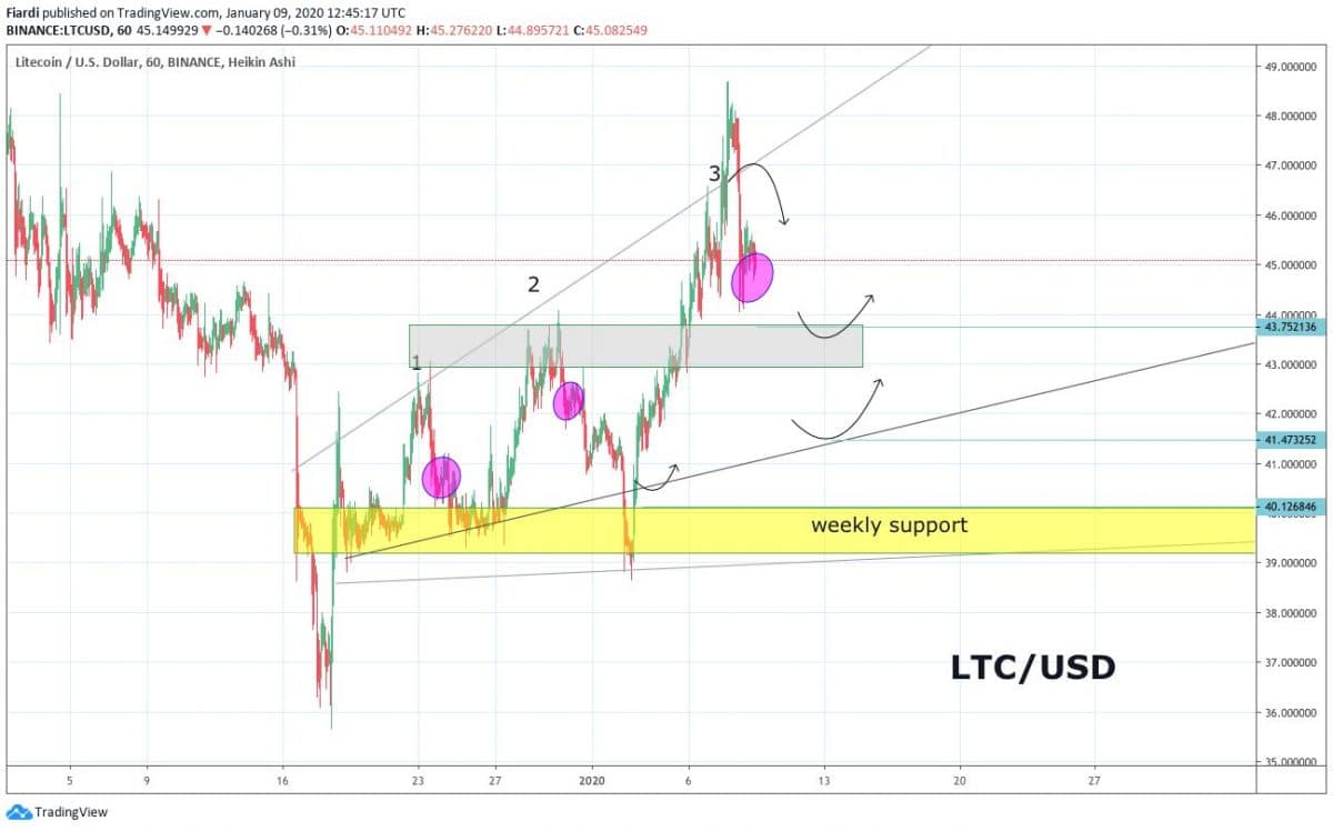 Litecoin zaznamenal současné dno po 6 měsíčním propadu na hodnotě 35,66 USD od těchto hodnot jsme se odrazili k současným 45 USD. Na grafu sledujeme rostoucí kanál a i v tomto případě se potvrdila 3. vlna růstu. Momentálně LTC poklesl díky Bitcoinu a bude dost záležet na tom, zda na Bitcoiu bulls potvrdí podporu. Nejbližší podpory jsou na 7 900 a 7 600 USD, od nich se může odrazit BTC nahoru. V případě LTC bude první podporou hodnota 43,75 USD jako podpora předešlého odporu a následně je tu ještě podpora na samém dně support line rostoucího kanálu. Momentálně zbývá jediné, počkat si na pokles Litecoinu a zaznamenat odraz od podpory na výše zmíněných hodnotách.