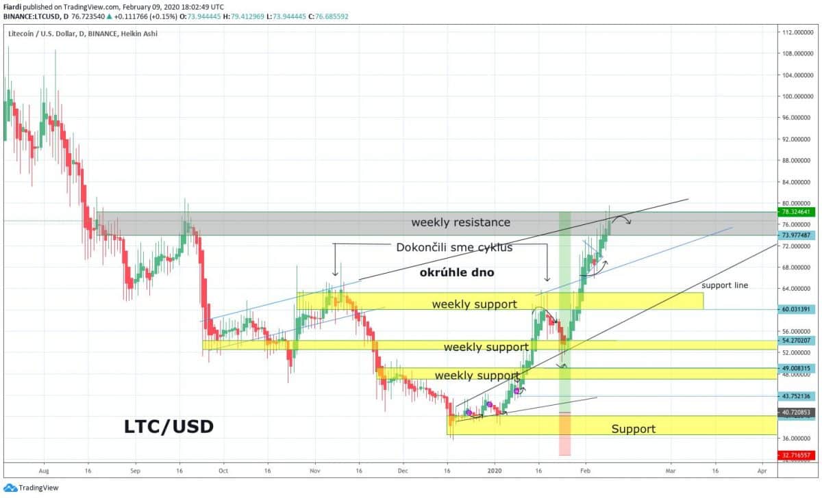 Pokud se bulls podaří prolomit odpor na 78 USD může bezstarostně LTC růst až k 105 USD kde vidíme další odpor.