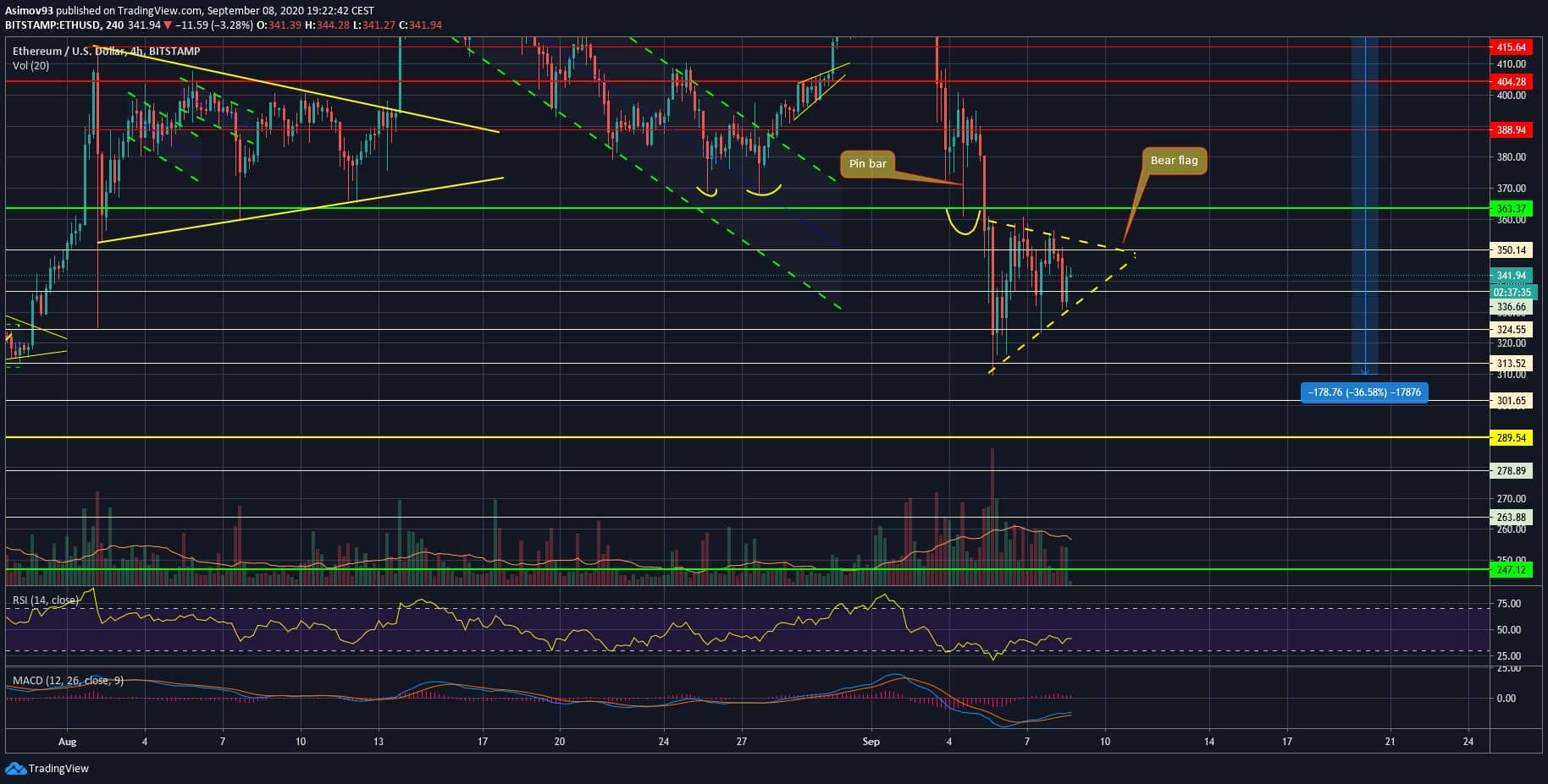 Každopádně, low je prozatím na 313,52 USD, kde došlo k automatické reakci v podobě odrazu kurzu. Vlastně jsmu tu měli pullback k S/R levelu 363 USD, kde se ovšem pozitivní momentum ihned ztratilo. Nakonec máme na trhu tři dny trvající konsolidaci, která má nyní podobu bear flagu. Technicky bychom tedy měli spíše počítat s tím, že pokles bude pokračovat.