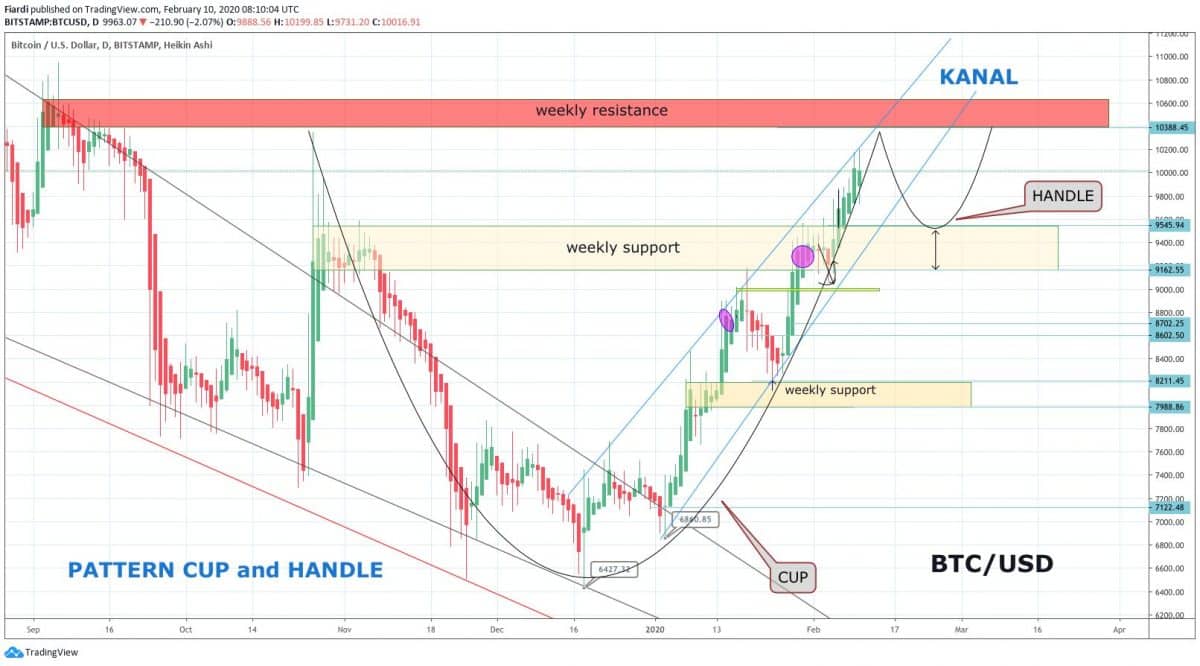 Při pohledu na další graf vidíme pattern, o kterém píšeme několik týdnů. Už při hodnotě 9 100 USD jsme uvažovali nad cup and handle patternem, který, zdá se, že až dosud vychází podle plánu. Podle něj dokončíme kulaté dno na 10 000 USD a vytvoříme ucho šálku, které by v našem případě mělo sahat do oblasti supportu v oblasti 9 550 – 9 100 USD.