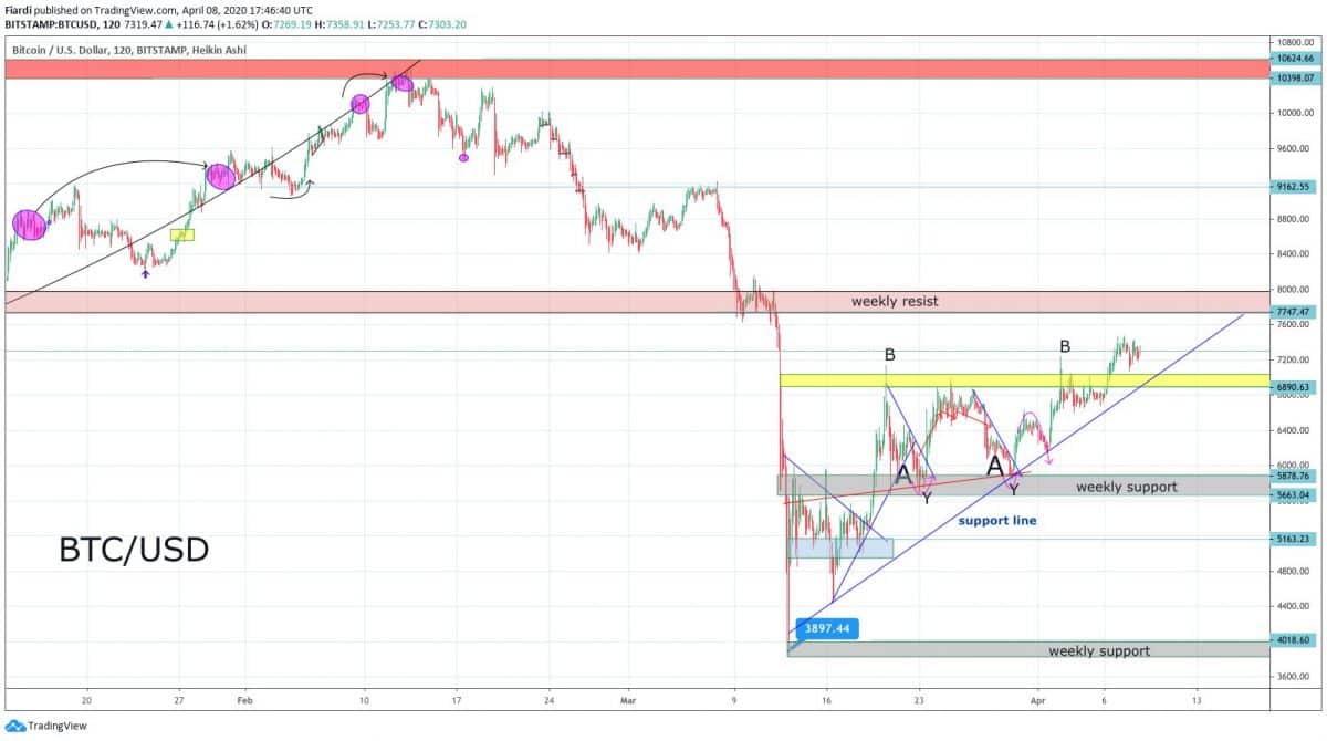 Mnoho investorů, kryptoměnových fanoušků a fanoušků Bitcoinu zvlášť bude zajímat momentální postup. Které hodnoty je nutné sledovat? Technická analýza v tom má jasno, nejbližší odpor vidíme na 7 700 USD. Podporu pak máme na 7 000 USD. Jak vidíme na grafu, Bitcoin se už více než 30 hodin zdržuje v pásmu 7 300 USD.