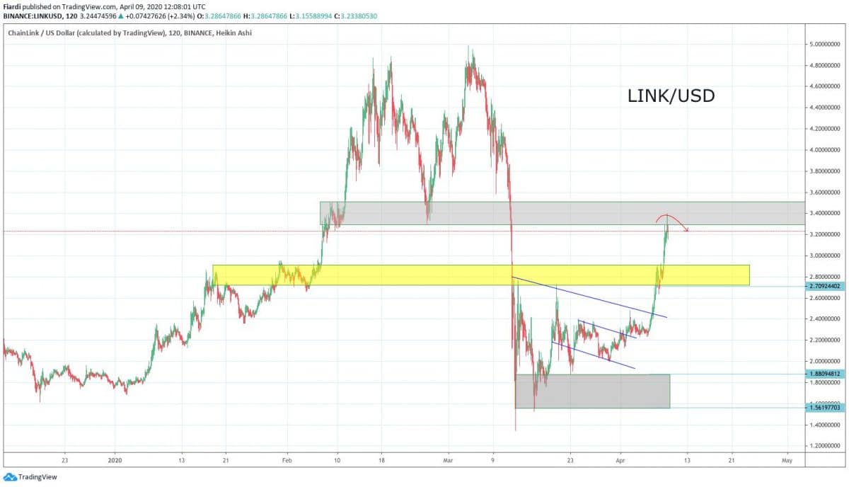 V dnešní analýze se podíváme na LINK, který se v roce 2020 dostal na high 4,98 USD. Letos ale také zažil slušný pád na low na ceně 1,35 USD. Ale momentálně je situace jiná a už 2 týdny vidíme (nejen na LINK) růst až k současné ceně 3,23 USD. Jak můžeme vidět na grafu, prolomili jsme odpor na 2,56 USD.