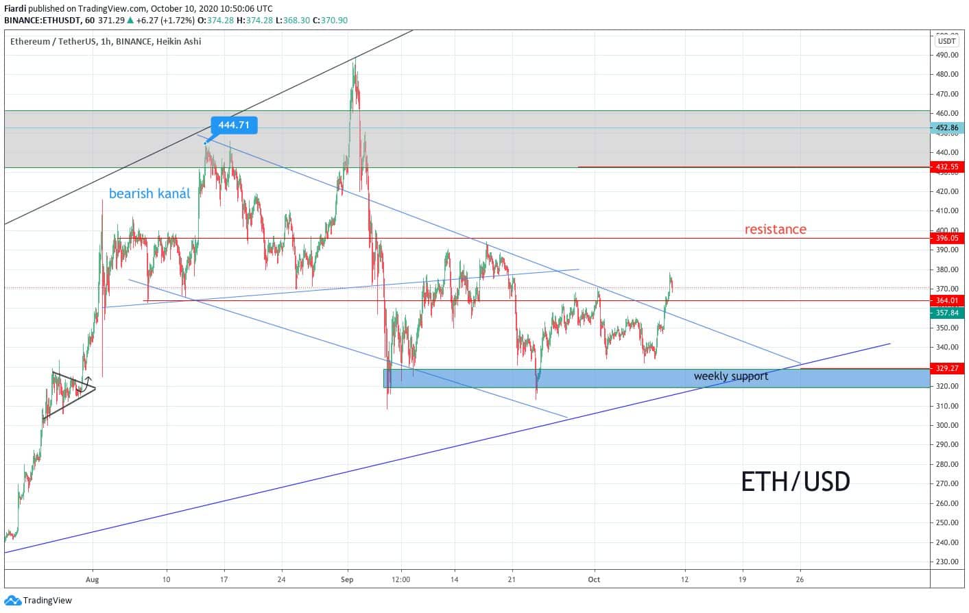 Ethereum na 471 USD znamená prolomení bearish kanálu, který trval 2 měsíce. Prolomení přišlo na hodnotě 358 USD. Medvědi konečně vypadli mimo trend a mohou nastupovat býci a nastolit nový trend růstu který může jistě trvat i v 1/4 roku 2021. Nejbližší odpor je na 395 USD. Podporu vidíme na 364 a 329 USD.
