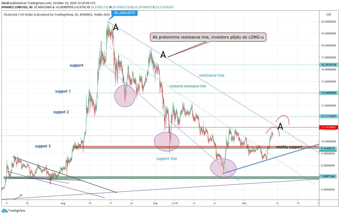 Na grafu vidíme výraznou podporu na hodnotě 9,14 USD. Odpor vidíme na 11 USD. Momentálně sledujeme naražení do odporu a postupný mírný pokles směrem k 10,5 USD. Bitcoin narazil na 11 400 USD a mírně poklesl po vzoru Bitcoinu. Celkově ale nečekám větší propady na LINK jak byly k 7 USD, dno jsme tak už zřejmě dosáhli.