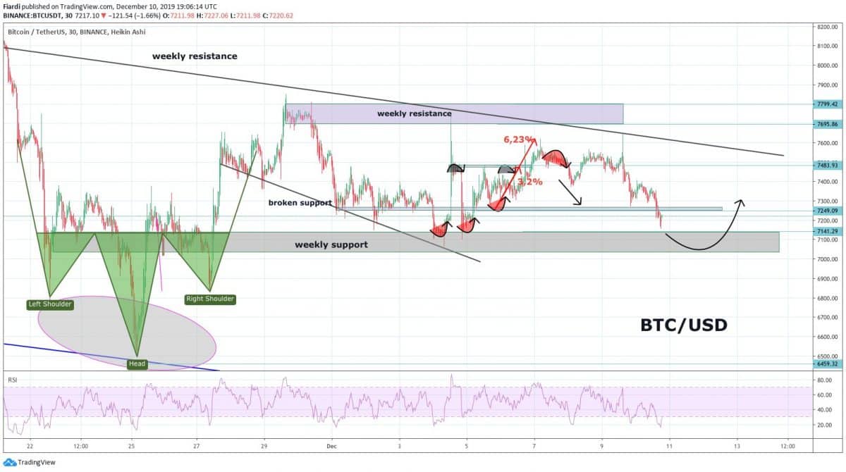 Cena Bitcoinu klesla v úterý poté, co čelila dalšímu silnému odmítnutí z oblasti psychického odporu. Bitcoin zavedl nové vnitrodenní minimum poblíž 7 274 dolarů, což je o 5,11 procenta nižší než týdenní maximum 7 552,92 USD. Tato oblast od pátku už čtyřikrát odmítla vzestupné pokusy Bitcoinu. Při vysokém prodejním tlaku cena nemá jinou možnost, než konsolidovat nebo znovu otestovat nižší úrovně.